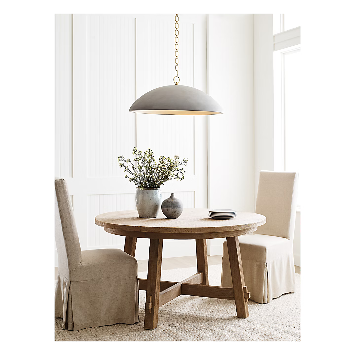 The sculptural Elliot by Suzanne Kasler presents a rugged-yet-refined silhouette in lightweight concrete. The unexpected material's smooth, inverted dome hangs from a slender chain and casts a light that's ideal over kitchen islands or dining room tables.